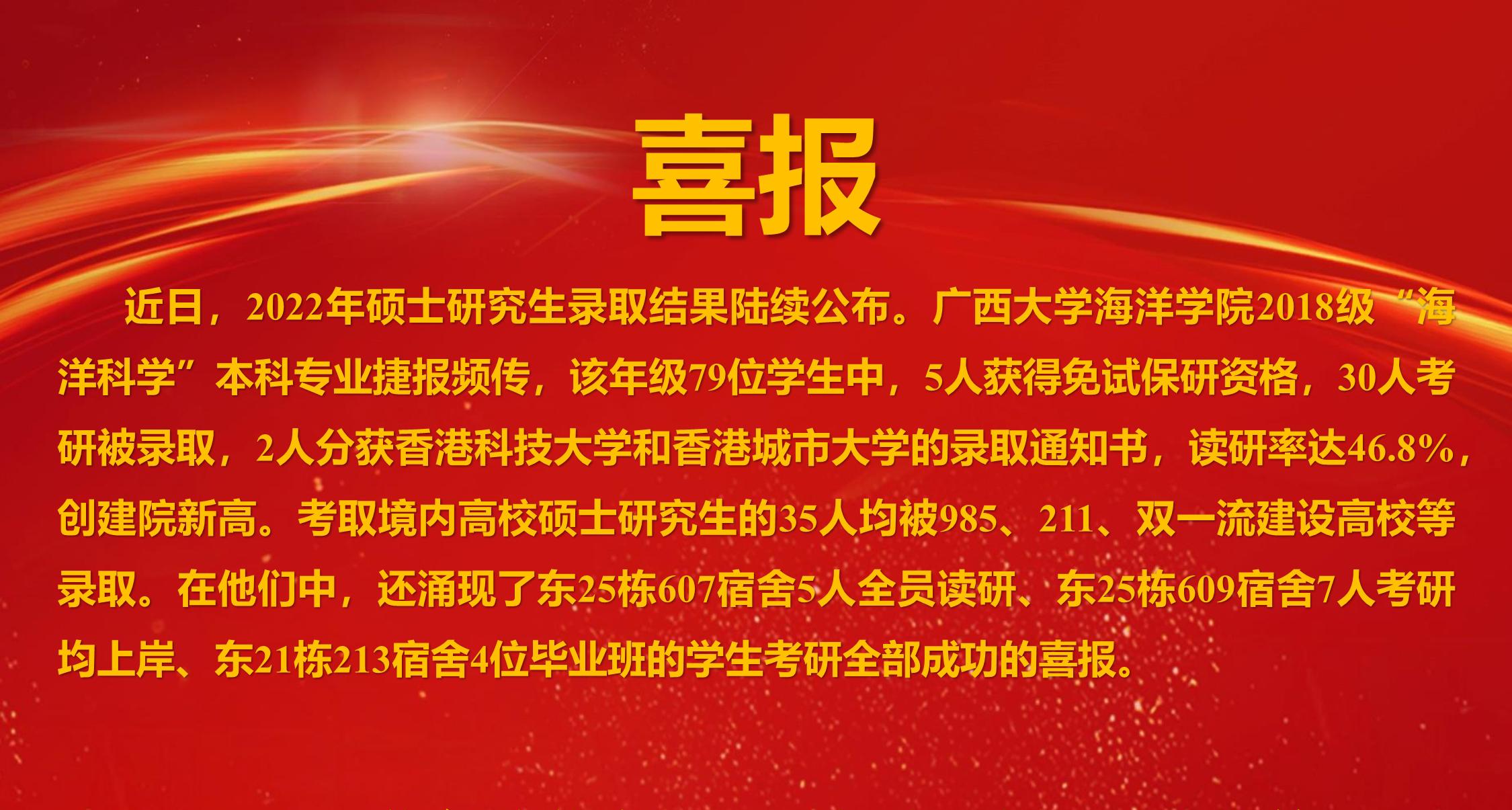 近日,2022年硕士研究生录取结果陆续公布。best365官方网站登录入口2018级“海洋科学”本科专业捷报频传,该年级79位学生中,5人获得免试保研资格,30人考研被录取,2人分获香港科技大学和香港城市大学的录取通知书,读研率达46.8%,创建院新高。考取境内高校硕士研究生的35人均被985、211、“双一流”建设高校等录取。在他们中,还涌现了东25栋607宿舍5人全员读研、东25栋609宿舍7人考研均上岸、东21栋213宿舍4位毕业班的学生考研全部成功的喜报。