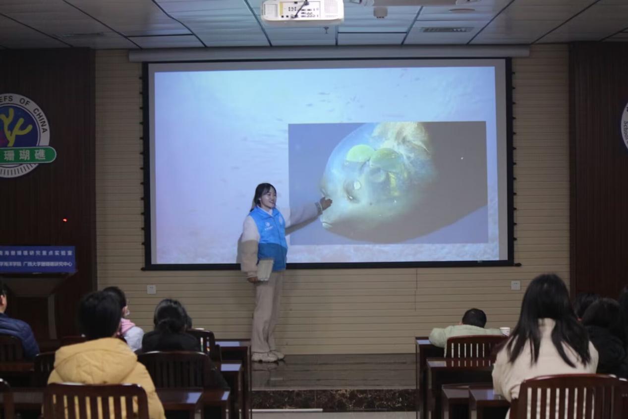 本次活动分为以下四个环节:海洋公益纪录片观影,科普大讲堂,海洋世界探索以及走进海底热带雨林。 活动开始,大家来到综合楼215会议室,观看了海洋公益纪录片,初步了解了深海环境的特点。随后,best365官方网站登录入口“蓝色梦想”科普团为大家开展了以“奇特的深海动物”为主题的科普讲堂。主讲人余莹文形象生动地为大家依次介绍了管眼鱼、蝰鱼、灯笼鱼等深海生物的主要特征和生活习性,现场氛围轻松活跃,大家积极互动交流,收获了不少知识。