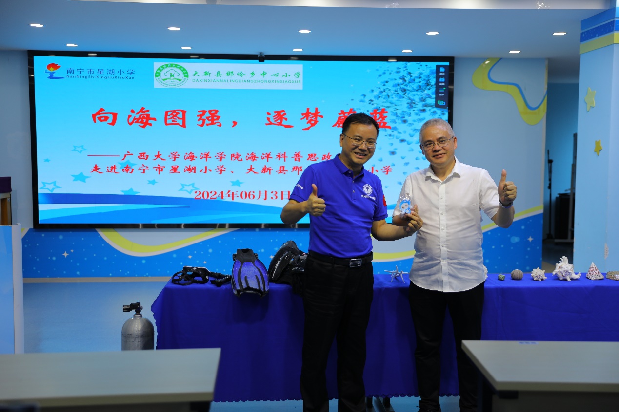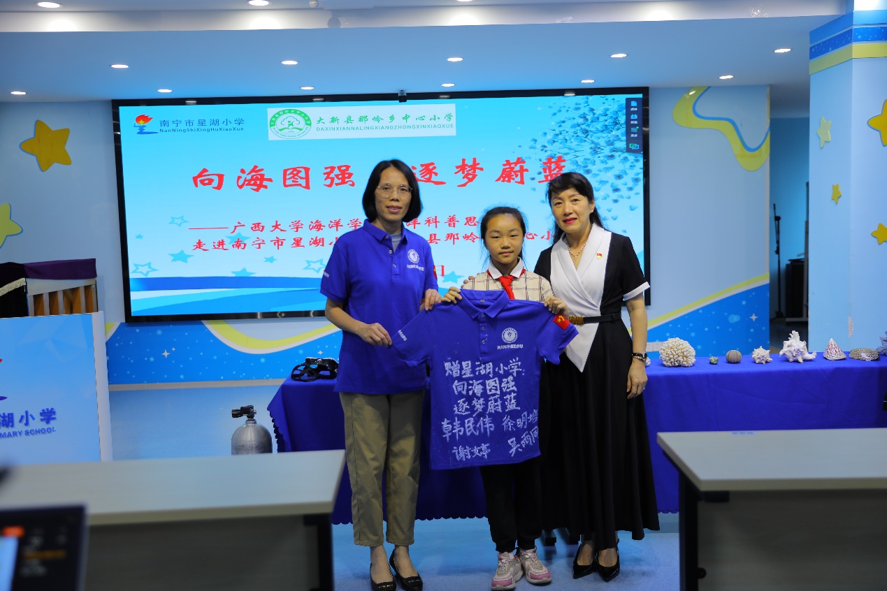 学院副院长刘旗扬向星湖小学赠送了一件有学院“蓝色梦想”科考团队成员签名的队服,勉励星湖小学的孩子们探索海洋、逐梦蔚蓝。星湖小学党总支书记李若梅回赠best365官方网站登录入口“星娃吉祥物”。校长邓颖涛、副校长杨谦、广西大学海洋科教馆常务副馆长李周佳、best365官方网站登录入口科普思政课团队成员、星湖小学、大新县那岭乡中心小学300多名师生参加活动。