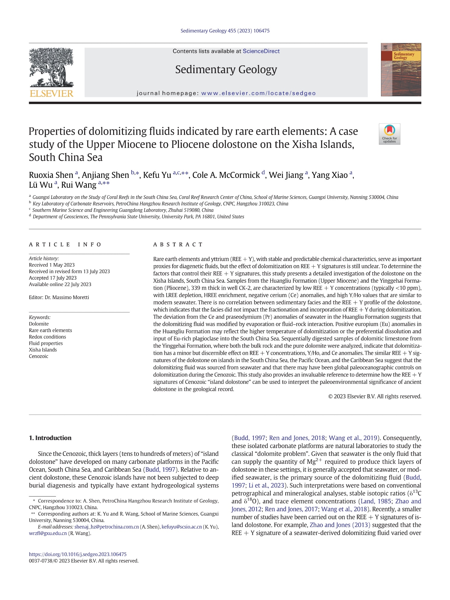 近日,在365官网王瑞副教授等的指导下,硕士研究生沈若夏以第一作者在国际沉积学经典期刊Sedimentary Geology上发表论文“Properties of dolomitizing fluids indicated by rare earth elements: A case study of the Upper Miocene to Pliocene dolostone on the Xisha Islands, South China Sea”。该论文系统评估了西沙群岛白云石化作用对稀土元素的影响,为岛礁“白云岩问题”研究提供了新的线索。
