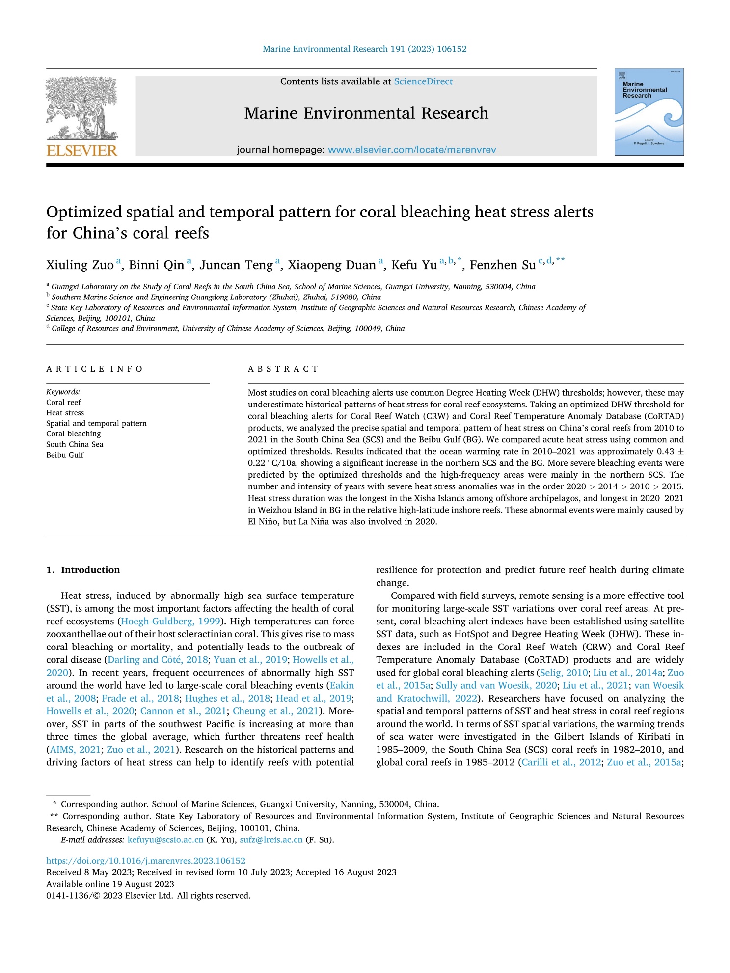 Zuo Xiuling, Qin Binni, Teng Juncan, Duan Xiaopeng, Yu Kefu, Su Fenzhen. Optimized spatial and temporal pattern for coral bleaching heat stress alerts for China’s coral reefs. Marine Environmental Research, 2023, 191, 106152. https://doi.org/10.1016/j.marenvres.2023.106152