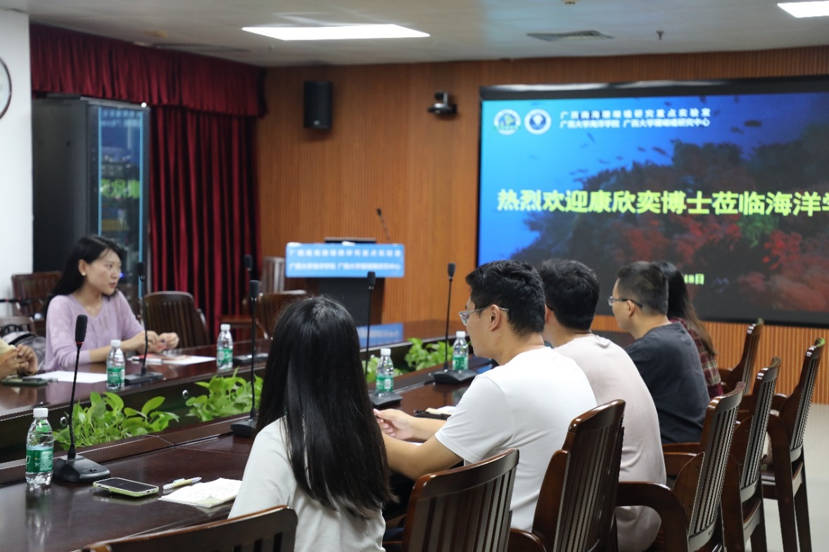 康欣奕博士在广西南海珊瑚礁研究重点实验室常务副主任黄荣永以及物理海洋教研室师生的陪同下参观了岛礁生态修复实验室和海洋科教馆。(王浠源/文 蓝弋朝/图 黄荣永 周剑/编辑 余克服/审核)