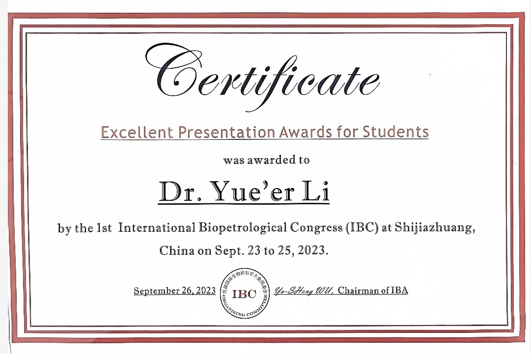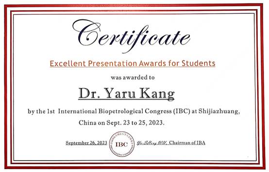 2023年9月22-25日,首届国际生物岩石学会议(The 1st International Biopetrological Congress)在河北石家庄举行,会议由国际生物岩石学学会和河北地质大学主办。本次会议有来自中、美、英、意、韩5国的250多位学者参加,其中包括十多位国内、国际顶尖专家。在本次大会中,365官网余克服教授获得“优秀组织者”奖(45位组织者,共3人获奖)。365官网2021级博士研究生康亚茹和2021级硕士研究生李悦儿获得“优秀学生报告”奖(共14位获奖)。报告题目分别为: