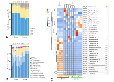 2020年发表在《Current Biology》期刊上的一篇野外观察性研究论文揭示珊瑚颜色表型变化伴随珊瑚白化过程, 这种颜色表型的变化与珊瑚排藻白化过程中珊瑚对光的吸收有关, 是珊瑚适应环境胁迫的一种表现。为了进一步验证该理论, 研究团队在我国南海海域采集了同一种具有不同表型的丛生盔形珊瑚,并以其为研究对象分析了这2种不同表型的珊瑚对热胁迫的响应。 研究发现呈现绿色表型的珊瑚个体相对呈现棕色表型的珊瑚个体具有较高的热白化耐受性。进一步通过共生微生物组成和基因转录水平变化分析发现, 呈现绿色表型的珊瑚个体具有较高的绿色荧光蛋白、氧化磷酸化、细胞生长与死亡相关基因转录水平及较低的病原细菌丰度。