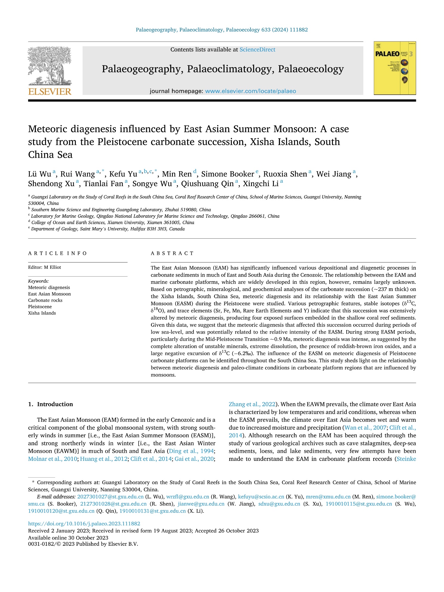 近日,在365官网王瑞副教授等的指导下,硕士研究生吴律以第1作者身份在经典SCI期刊Palaeogeography Palaeoclimatology Palaeoecology(二区Top)上发表论文“Meteoric diagenesis inffuenced by East Asian Summer Monsoon: A case study from the Pleistocene carbonate succession, Xisha Islands, South China Sea”。该论文揭示了更新世时期西沙地区珊瑚礁灰岩的大气淡水成岩作用受到了东亚季风的影响,为了解碳酸盐岩台地发育演化与古气候之间的关系提供了新的视角。