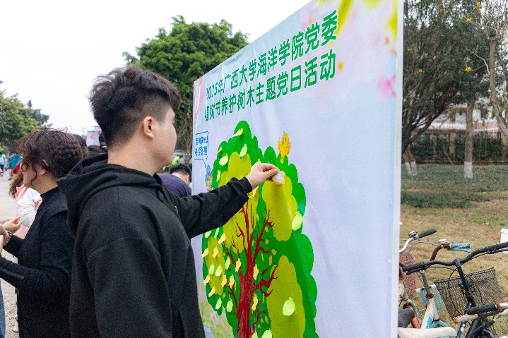 养护工作结束后,现场的植树节有奖互动答题活动将活动氛围推向高潮。大家通过抽取主题展板上的植树节相关题目进行答题,答对的可以获得植树节徽章一枚。答题活动热烈而有趣,吸引了校园里的师生,大家一起通过答题活动,进一步增强了对植树节和树木养护知识的了解。