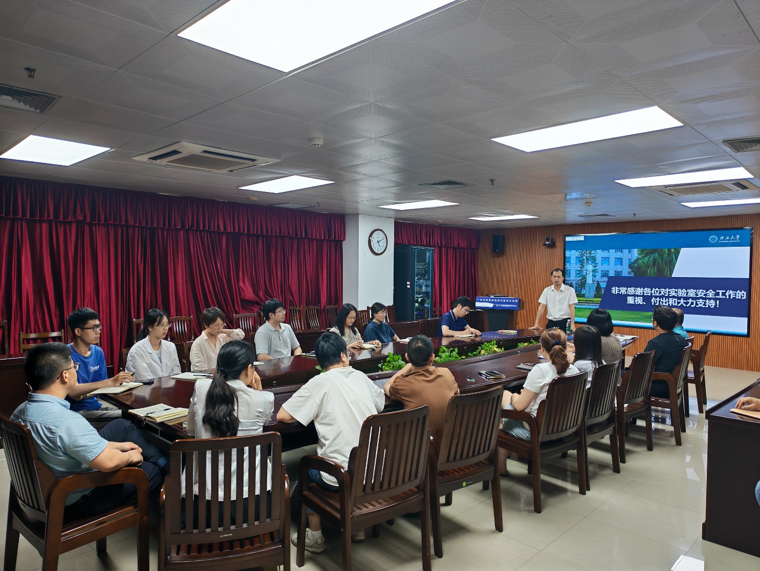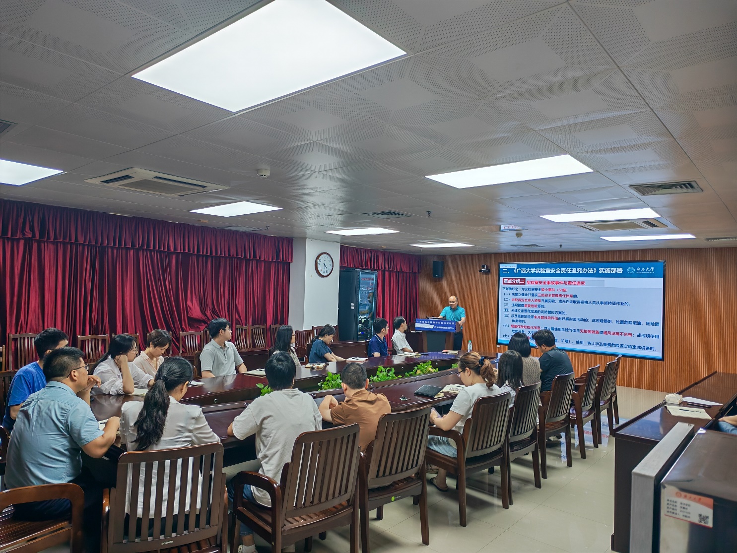 陆翔副处长对《广西大学实验室安全责任追究办法(2025 年修订)》进行了深度解读。他从修订背景、目的意义入手,结合高校实验室安全典型案例,对责任划分、违规行为界定、责任追究程序等内容进行了详细阐释,让与会人员对新规有了全面且深入的认识。