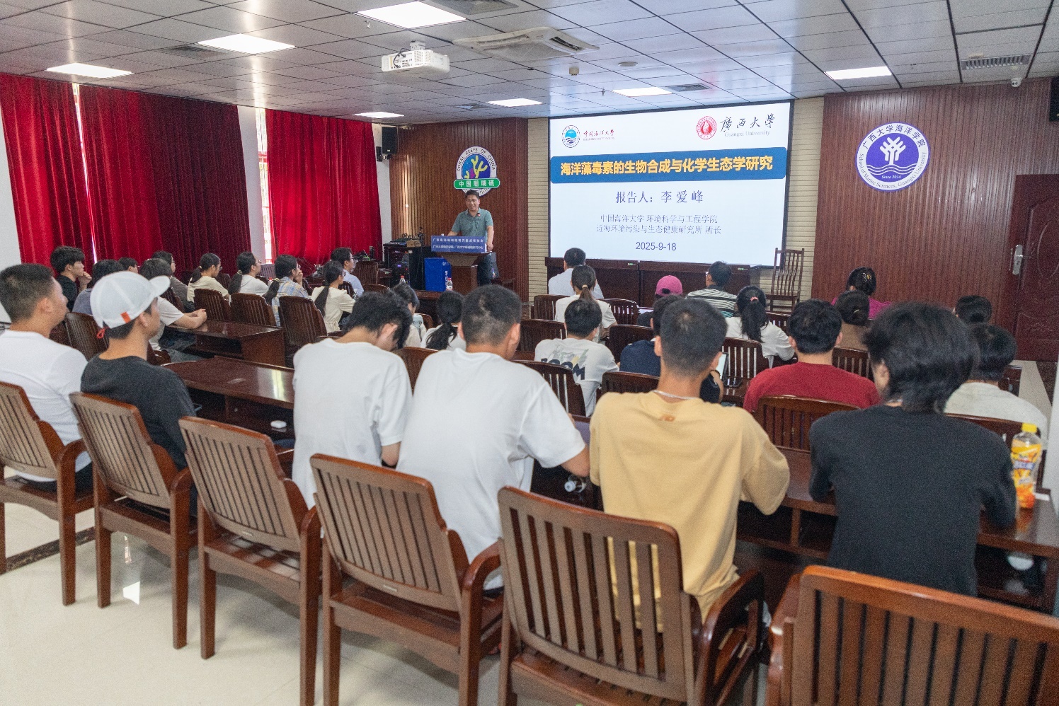 9月18日下午,中国海洋大学环境科学与工程学院、近海环境污染与生态健康研究所所长李爱峰教授应院长余克服教授邀请,莅临365官网“走进海洋,走进科学”海洋科学前沿系列讲座,为师生作题为“海洋藻毒素的生物合成与化学生态学研究”的学术报告。报告由雍阳阳副教授主持。