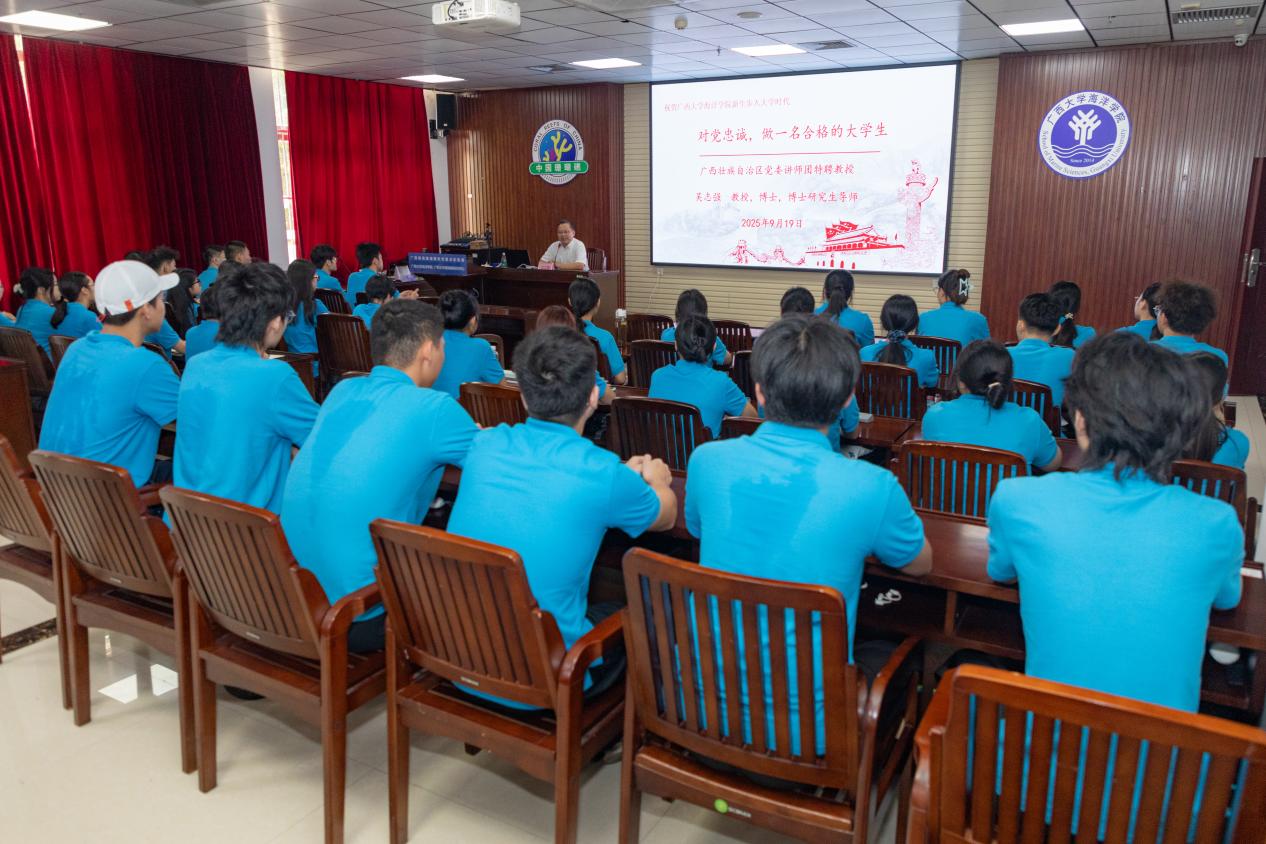 9月19日,广西壮族自治区党委讲师团特聘教授、365官网客座教授吴志强教授以《对党忠诚,做一名合格的大学生》为题在215会议室为2025级本科新生带来了一场颇具教育意义的讲座,学院党委副书记、纪委书记黄学勇主持讲座。每年,深受师生敬爱的吴志强教授都会无私地莅临365官网《走进海洋,走进科学》大讲堂,用他广博的知识、深邃的见解和诚挚的情怀,为我们本科新生指引前行的方向。这已是他连续的第十年为学院新生点亮大学启航的第一盏灯塔。