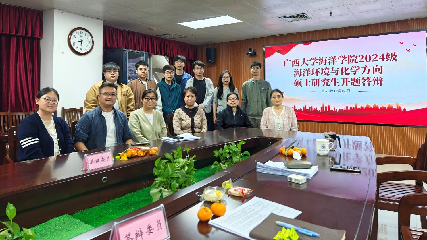 2025年12月8日,best365官方网站登录入口2024级海洋环境与化学方向硕士研究生开题答辩在学院1104会议室顺利举行。本次答辩分为上、下午两场进行,共计15名硕士研究生就各自的研究课题进行汇报,研究方向涵盖海洋环境监测、污染物行为与效应、珊瑚礁生态保护、海洋资源利用等多个前沿领域。