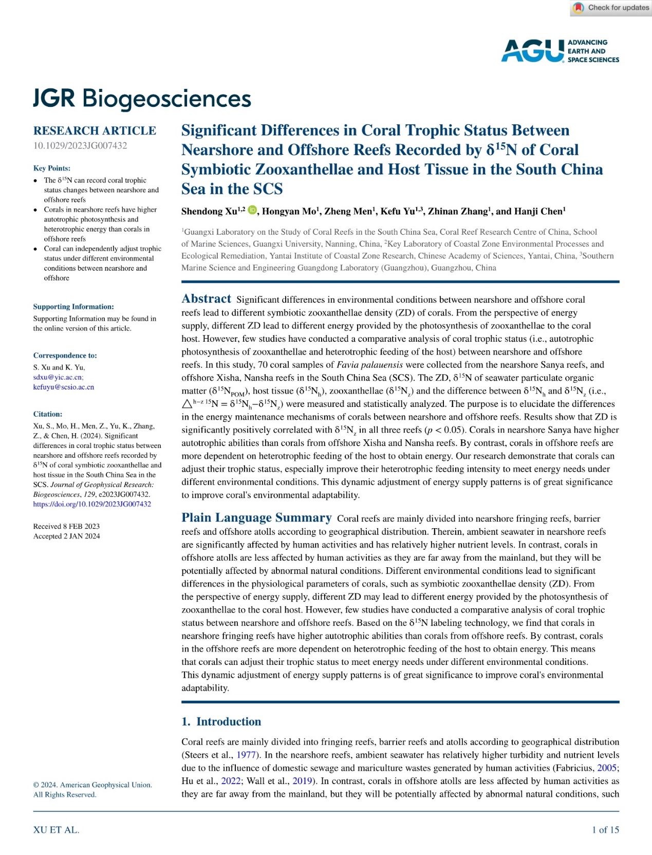 Xu S., Mo H., Men Z., Yu K., Zhang Z., & Chen H. Significant differences in coral trophic status between nearshore and offshore reefs recorded by δ15N of coral symbiotic zooxanthellae and host tissue in the South China Sea in the SCS. Journal of Geophysical Research: Biogeosciences, 2024, 129, e2023JG007432. https://doi.org/10.1029/2023JG007432.